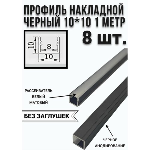 Профиль черный алюминиевый для светодиодной ленты накладной 10х10 - 1м - (набор х 1000мм 8 штук) с заглушками