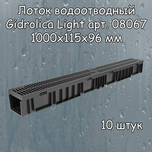 10 штук лоток водоотводный 1000х115х96 мм Gidrolica Light с решеткой пластиковой щелевой DN100 (А15), артикул 08067