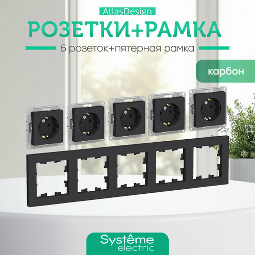 Розетка черная с заземлением комплект с рамкой ATN001043-5-ATN001005 ATLASDESIGN 5 постов Systeme Electric Schneider