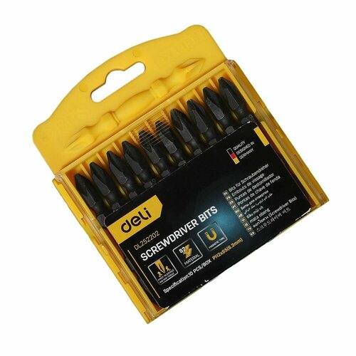 Набор двухсторонних торсионных бит для ударных шуруповертов 10 шт Deli DL253202 PH2*100мм, сталь S2, пласт. кейс