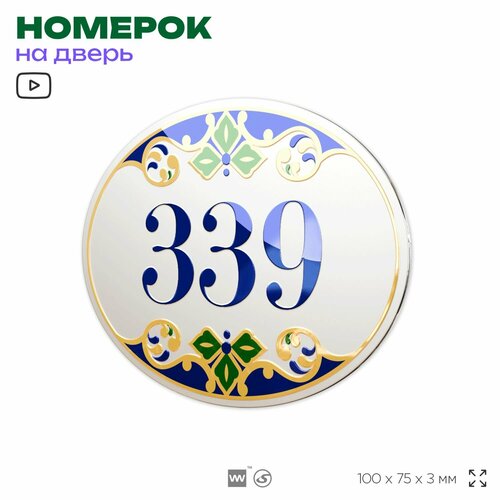Номер на дверь квартиры 339, для кабинета, офиса, в средиземноморском стиле, шильдик 10 х 7,5 см, белый, Айдентика Технолоджи