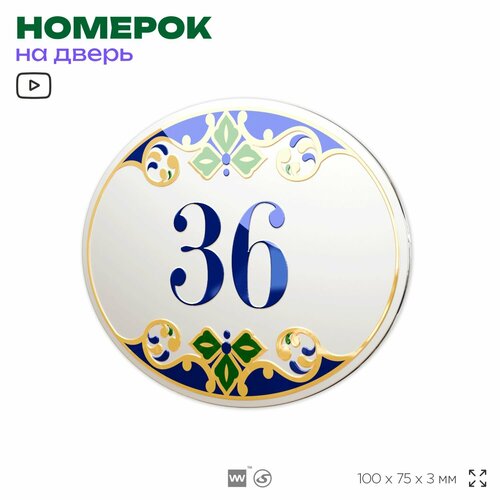 Номер на дверь квартиры 36, для кабинета, офиса, в средиземноморском стиле, шильдик 10 х 7,5 см, белый, Айдентика Технолоджи