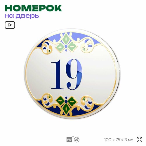 Номер на дверь квартиры 19, для кабинета, офиса, в средиземноморском стиле, шильдик 10 х 7,5 см, белый, Айдентика Технолоджи