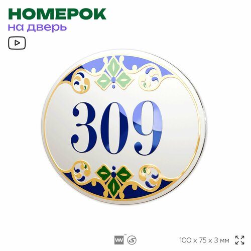 Номер на дверь квартиры 309, для кабинета, офиса, в средиземноморском стиле, шильдик 10 х 7,5 см, белый, Айдентика Технолоджи