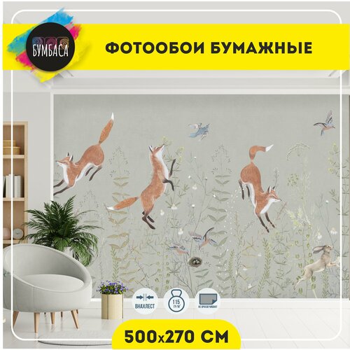 Фотообои бумажные Лисы на полянке. Серо-зеленые. Серия "Природа" 500х270 см