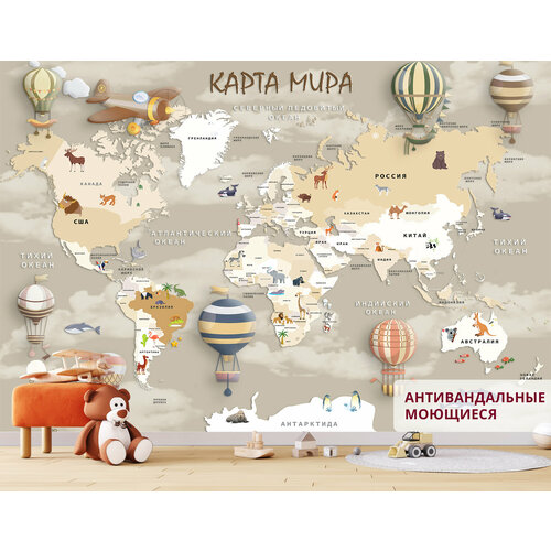 Фотообои на стену флизелиновые детские Карта мира и Воздушные шары 400х270 см