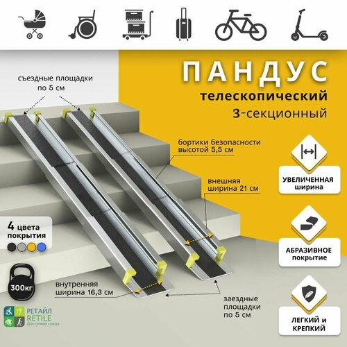 Пандус телескопический 3-секционный Ретайл Антислип 160 см, серый (рабочая длина 150 см + 2 опор. площадки по 5 см), переносной для детских колясок