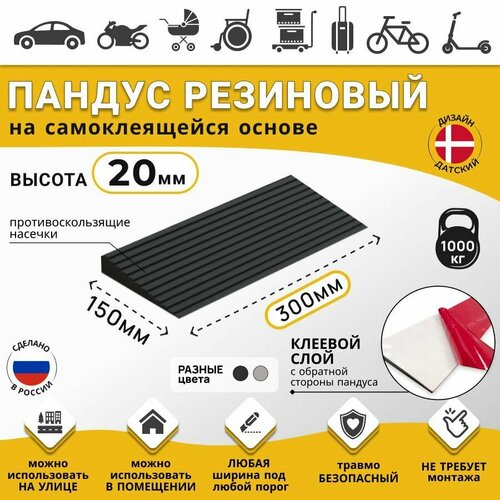 Пандус полимерный рубеж для порогов высотой 2 см (20х300х150 мм) самоклеящаяся основа, чёрный, для колясок, склада и автомобилей