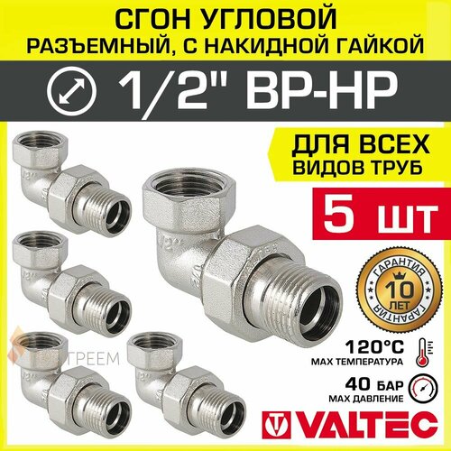 5 шт - Сгон угловой 1/2" ВР-НР VALTEC разъемный, латунный / Американка резьбовая (угольник с накидной гайкой) ДУ 15 для монтажа труб, арматуры в системе отопления и водоснабжения, VTr.098. N.0004