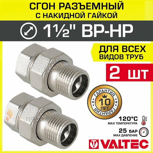 2 шт - Сгон прямой 1 1/2" ВР-НР VALTEC разъемный, латунный / Американка резьбовая (муфта с накидной гайкой) ДУ 40 для монтажа труб, арматуры в системе отопления и водоснабжения, VTr.341. N.0008