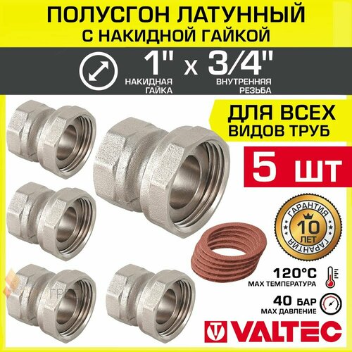 5 шт - Полусгон 1" х 3/4" Накидная гайка-ВР VALTEC, латунный никелиров. / Фитинг резьбовой для монтажа арматуры, расширительного бака, котла к трубе ДУ20-25 с разъемным соединением, VTr.614. N.0605