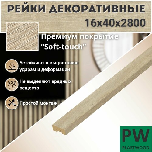 Декоративные рейки, 16х40х2800 мм, 12 шт, МДФ, Дуб сонома, PLASTWOOD, для стен и потолков