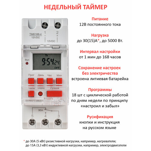 Электронный цифровой таймер включения / выключения по времени на din рейку TM919 12В 30А 5000Вт