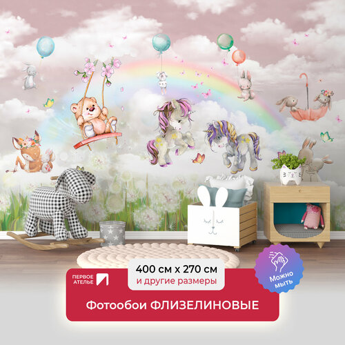 Фотообои детские на стену флизелиновые животные первое ателье "Зверята, единорожки и зайчата под радугой" 400х270 см (ШхВ), моющиеся, Premium