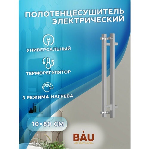 Полотенцесушитель дизайнерский электрический, профильный BAU Stella Square 10х80, 2 коллектора, 1 крючок, нерж. сталь полированная