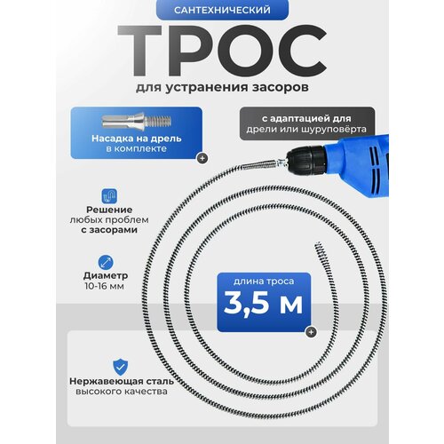 Трос сантехнический Standard 3.5 метра для прочистки труб и устранения засоров в канализации с насадкой на дрель или шуруповерт / Стальной 10 мм
