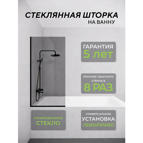Стеклянная душевая шторка тонированное стекло 8 мм на ванну 140х70 смс черным профилем, душевое ограждение