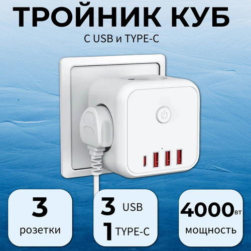 Тройник для розетки с USB и Type-C, разветвитель, сетевой фильтр, переходник-куб