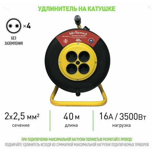 Силовой удлинитель на пластиковой катушке ПВС 2х2,5 mm 40 Метров/ 4 Розетки/ Без заземления