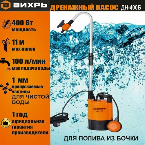 Насос дренажный погружной для полива из бочки вихрь ДН-400Б // для чистой воды (частицы до 1мм) /100 л/мин (с поплавковым выключателем) садовый