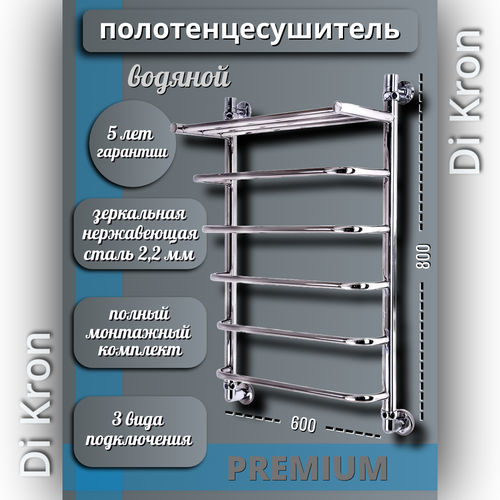 Полотенцесушитель Водяной с полкой Di Kron, модель Premium-S2 800х600 из нержавеющей стали, 3 вида подключения, лесенка