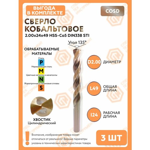 Сверло кобальтовое 2.00x24x49 HSS-Co5 DIN338 3 штуки "СпецТехИнструмент"
