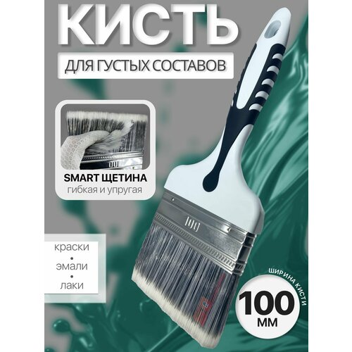 Кисть малярная плоская 100 мм универсальная, серебристая щетина, с эргономичной 2K ручкой Decor Black White PREMIUM/ для лаков и пропиток