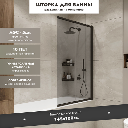 Стеклянная перегородка (шторка, ширма) на борт ванны раздвижная на монопетле профиль тонированное стекло