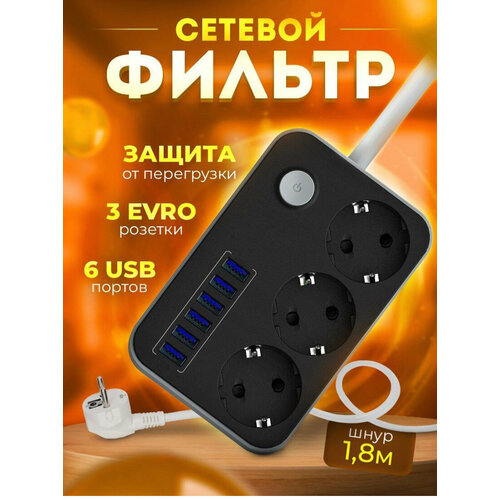 черныйВысококачественный компактный сетевой фильтр с USB. 3 EURO розетки, 4 USB порта+1 Type-C. Удлинитель сетевой предназначен для бытового использования, для питания ПК, ноутбука, смартфона, бытовых кухонных приборов, с защитой для вашей техники от скачков напряжения сети.