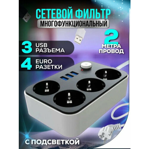 Сетевой фильтр с 3-мя usb, 4 розетками и с защитой предохранителем / Удлинитель сетевой / тройник электрический
