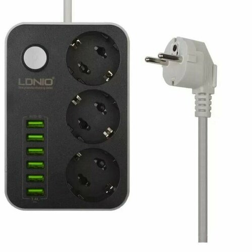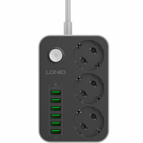 Сетевой фильтр (удлинитель) LDNIO SE3631, 10А, 2500Вт, 3 розетки, 6 USB-порта, 3.4А, 17Вт, 1.6м, черно-белый