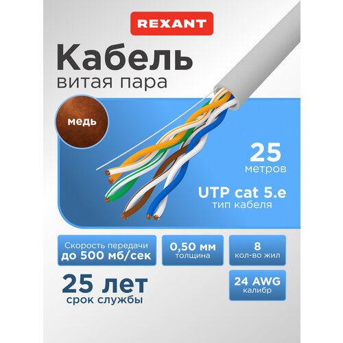 Кабель U/UTP, CAT 5e, PVC 4x2x0,50мм, 24AWG, внутренний, 25м REXANT