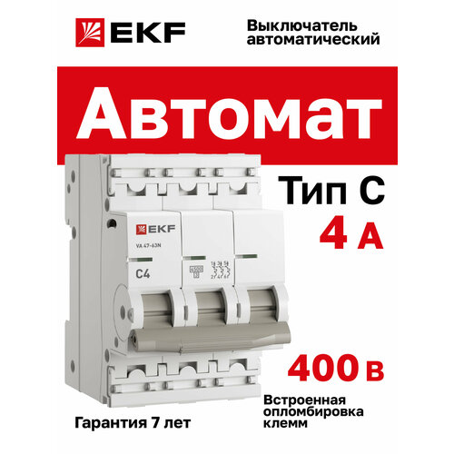 Автомат 4А, тип C, трехполюсный 3P, 4,5kA, cо встроенной опломбировкой клемм EKF PROXIMA ВА 47-63N (Автоматический выключатель C4)