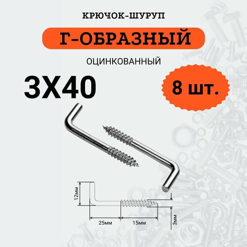 Крючок-шуруп стальной, оцинкованный, 3х40 Г-образный (Костыль), 8 шт.