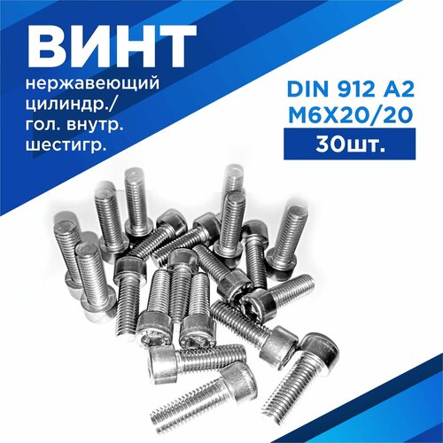 Винт М6х20 мм, нержавеющая сталь А2, цилиндр/гол, внутр/шестигр, полная резьба комплект 30шт