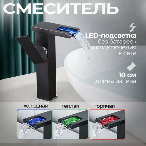 Смеситель для раковины с каскадным изливом и подсветкой Bono Black, кран для ванной из нержавеющей стали