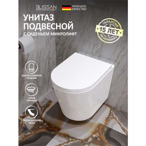 Унитаз подвесной безободковый BLISSAN Breeze смыв скрытый Торнадо 3.0 с сиденьем микролифт быстросъемное