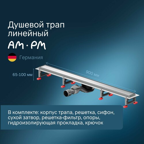 Трап для душа AM.PM PrimeFlow 80 см, матовая сталь, линейный душевой трап 45 л/мин, двухсторонняя решетка, универсальный затвор Tile, решетка с фильтром