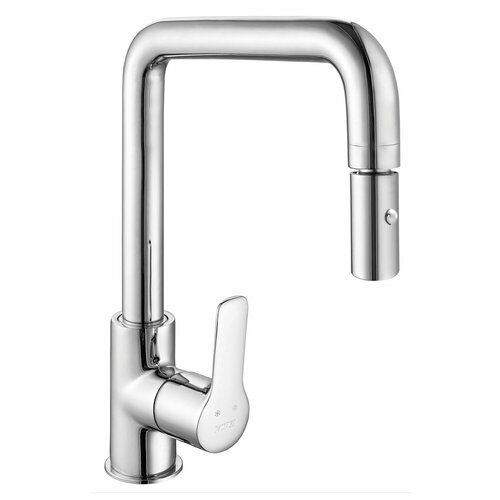 Характеристики:- Цвет: хром.- Материал: латунь.- Управление: однорычажное.- Механизм: керамический картридж.- Излив: поворотный.- Шарнирный ручной душ с двумя режимами.- Тип подводки: гибкая.- Стандарт подводки: 3/8.- Расход воды: 6.4 л/мин.- Отверстий для монтажа: 1.- Монтаж: на мойку, на столешницу.