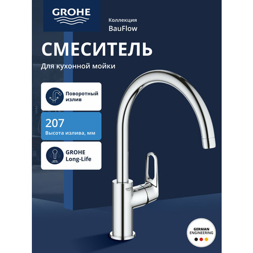 Смеситель для кухонной мойки, GROHE Bauflow 31230001, хром
