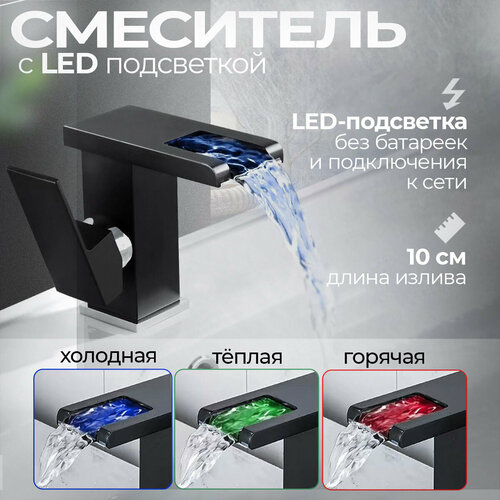 Смеситель для раковины с каскадным изливом и подсветкой Bono Black, кран для ванной из нержавеющей стали
