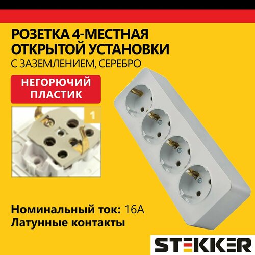 Розетка четырехместная с заземлением STEKKER 250В, 16А, серия София, серебро