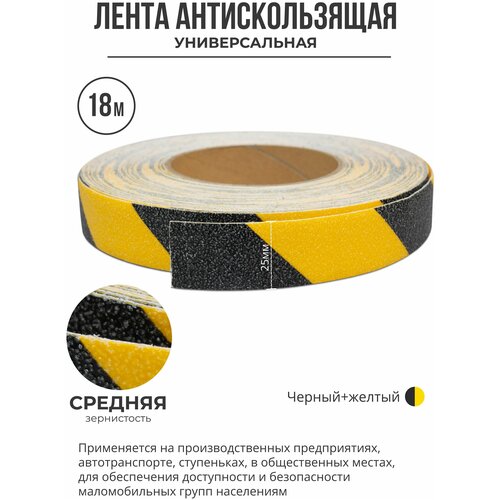 Противоскользящая самоклеящаяся лента. Средняя зернистость. 25 мм. Черно-желтая