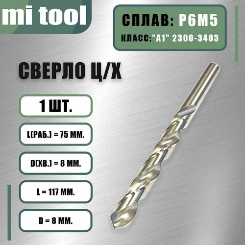 Сверло 8,0 мм ц/х по металлу Р6М5 класс "А1" 2300-3441