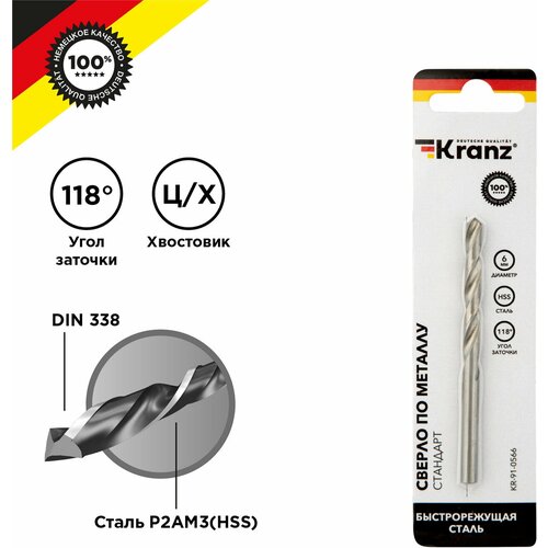 Сверло KRANZ по металлу 6,0 мм повышенной прочности с углом заточки 118 градусов HSS, 1 шт. в упаковке, DIN 338