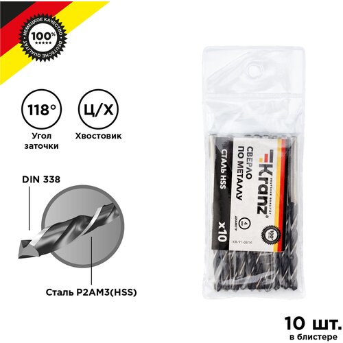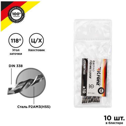 Сверло KRANZ по металлу 4,0 мм повышенной прочности с углом заточки 118 градусов HSS, 10 шт. в упаковке, DIN 338
