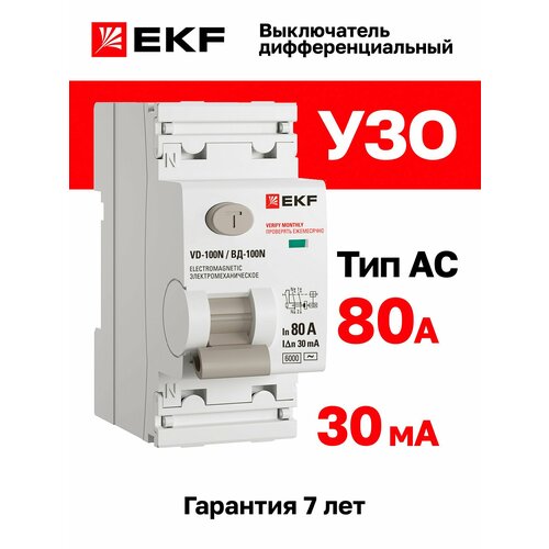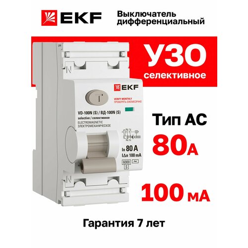 Выключатель дифференциального тока ВД-100N (S) 2P 80А 100мА тип AC эл-мех 6кА PROXIMA EKF