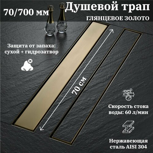 Трап для душа - лоток под плитку TIM 70х700мм с горизонтальным выпуском глянец золотой из нержавеющей стали с сухим и гидрозатвором TIM BAD487002GP