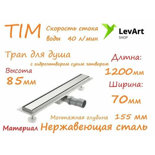 Душевой лоток из нержавеющей стали, с решеткой, цвет: Вороненая сталь 70х600мм (сухой +гидрозатвор) TIM BAD476002GY