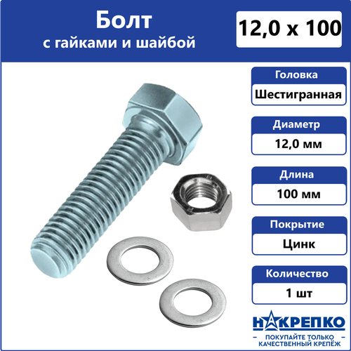 Болт оцинкованный М12 х 100 мм с шайбой и гайками 1 шт Накрепко
